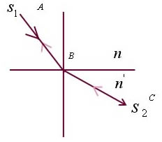 光源S1發(fā)射的光線經(jīng)B點(diǎn)折射向C. 若在C點(diǎn)置一光線,光線亦可由C點(diǎn)出射經(jīng)B點(diǎn)折射而射向A,即光線是可逆的。