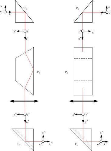 棱鏡展開方法:在棱鏡上截面內,按反射面的順序,以反射面與主截面的交線為軸,依次使上截面翻轉180°,便可得到棱鏡的等效平行平板。