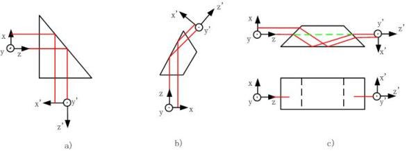簡單棱鏡,在主截面內的坐標改變方向,垂直于主截面的坐標不改變方向,而O’Z’始終沿出射光軸方向。