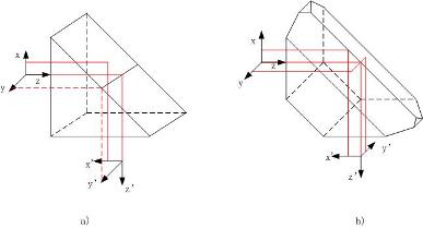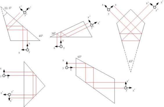 3.平行于主截面的坐標軸 o’x’的方向視反射面個數(屋脊面算二個反射面)而定。如果物坐標系為右手坐標系,當反射面個數為偶數時,O’X’坐標軸按右手坐標系確定;而當反射面個數為奇數時,O’X’坐標軸依左手坐標系確定。