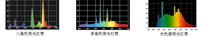 由圖示可見 , 三基色熒光燈管主要含有 RGB 三種光譜成份,它的顯色指數一般為 70%-80% ,只能用于普通照明,不能用來觀察顏色。多基色熒光燈管除了含有 RGB 三種光譜成份外,還含有一些其它的光譜成份,它的顯色指數一般為 90% 左右,可以用在服裝商店,珠寶店,超市進行一般的顏色觀察。全色譜熒光燈管包含有大部份的太陽光譜成份,它的顯色指數一般為 98% ,可用作專業的色彩匹配,是觀察顏色的理想的光源。