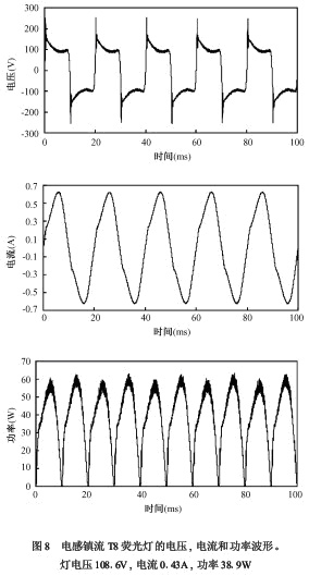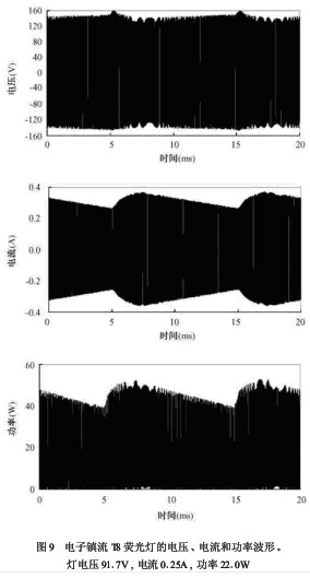 對于同樣色溫的熒光燈,充氣種類 (如氬或氪)對光波動幾乎沒有影響[7]。熒光燈的瞬時電壓、電流和功率如圖8、圖9所示。由于燈電壓接近方波,因此燈的功率波形基本由電流波形決定。電感鎮流器頻率為50Hz,電子鎮流器的頻率為48kHz。