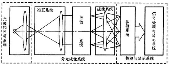 分光測試儀的光學結構相對較為復雜,圖2為分光測色儀的光學原理結構圖,包括了光源、照明系統、準直系統、色散系統、成像系統和感應探測系統。