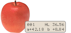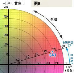 | L*C*h色空間使用與L*a*b*色空間一樣的色度圖,但是它使用柱面坐標而不是直角坐標。 在該色空間中,L*代表亮度且與L*a*b*色空間中的L*相同,C*為色飽和度,h為色調角。 在圓心處色飽和度C*的值為0,離圓心越遠C*值越大。 色調角被規定為從+a*軸開始并以度數表示: 0為+a*(紅),90為+b*(黃),180為-a*(綠),270為-b*(藍)。 如果我們用L*C*h色空間來測量蘋果的顏色,我們將得到下列結果。 如果我們把這些值描繪在圖9上,我們就得到點(A)。 |