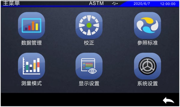 參照標準有ASTM(美標)和ISO兩種,本系列儀器在ASTM(美標)和ISO標準切換后,進行樣品測量時,儀器需要重新進行校正。在測量界面按“介”進入主菜單,在其他界面可以通過點擊下側的確認“√”、返回“〈”進入主菜單,如圖所示。