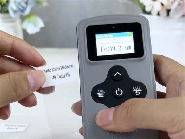 把校準片放到機體上,底部對準校準片,即可顯示微米值。從薄到厚,依次測量五組數據,測量出的數值可以直接和標注的厚度值進行對比。以第一組數據為例,樣品標注厚度:49.7um、測量厚度49.2um,相差0.5um,波動范圍1%,屬于正常范圍;