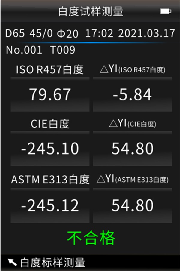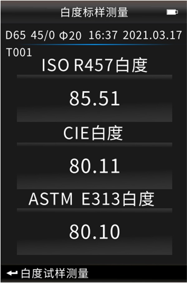 在主菜單界面按“返回”鍵,進入“白度測量”界面,如圖所示。此時,將測量口徑對準貼緊標樣樣品,按下“測量”鍵,獲得標樣的白度數據。
