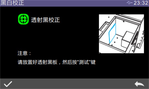 進入主菜單界面,點擊“黑白校正”進入透射黑校。將透射黑板放入透射樣品倉,并貼緊積分球側,合上樣品倉蓋,按下測量鍵進行校正。