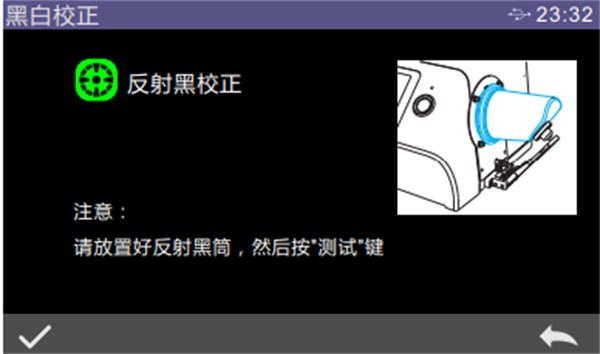 在主菜單界面點擊“黑白校正”進入黑白校正界面。在界面中會顯示目前校正是否有效以及校正有效剩余時間。點擊“→”,進入反射黑校界面,根據提示放好黑筒,然后按測量鍵進行黑筒校正。或者按“”取消并退出校正。