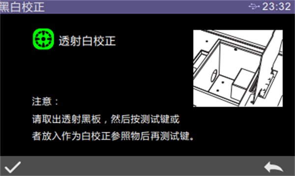 反射黑校完成后自動進入反射白校界面,放好白板(與安放黑筒的步驟相同),然后按測量鍵進行白校正,或點擊“←”取消并退出校正。