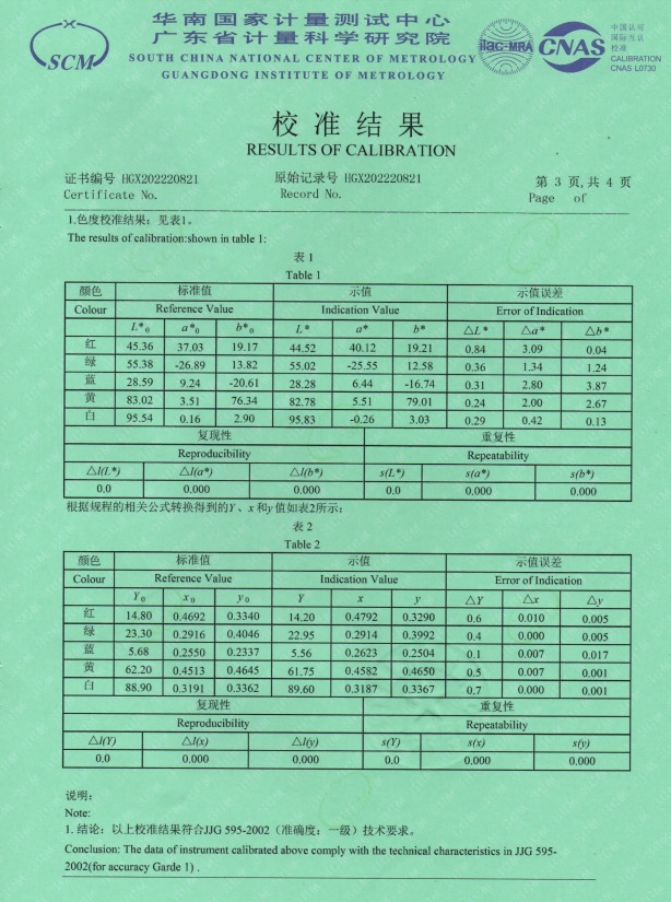 為了觀察得更為直觀,可以參看一級(jí)色差儀計(jì)量證書,示例:配色云色差寶PSY01。