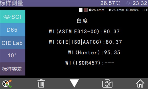 色度指標設置后,被選中的顏色指數會在標樣和試樣測量界面的顏色指數區顯示(根據指數的不同,部分指數只在試樣測量有顯示,且受透射和反射類型影響)。在測量界面或查看記錄界面點擊“V”可以翻頁到顏色指數顯示區,如圖為白度顯示界面。