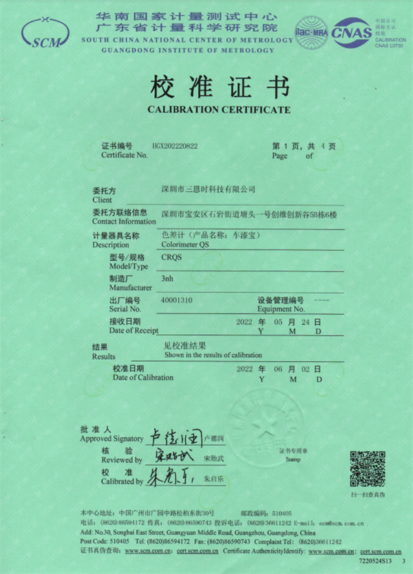 車漆寶CRQS校準證書如下: