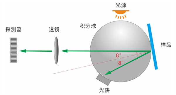 當光線進入積分球后,會在球壁上多次反射,然后從測量孔或光源孔射出積分球。一束光從任意的不通過球心的角度照進積分球,經過球壁的多次反射后,會從各個角度照射到樣板,最終通過測量孔或光源射出積分球。測量孔是在與法線夾角成8°的位置,由一組光電管構成的探測器。