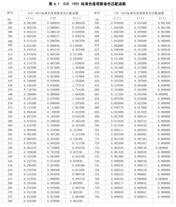 CIE 1931標(biāo)準(zhǔn)色度觀察者色匹配函數(shù)應(yīng)按表A.1確定。