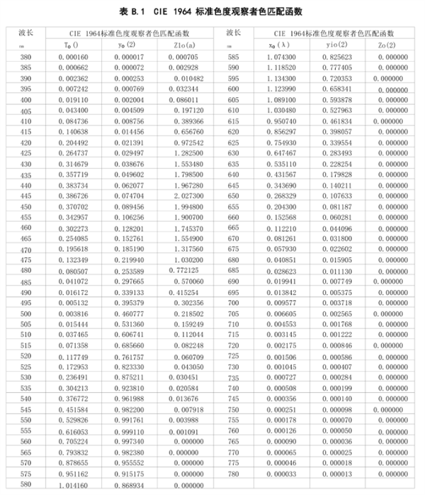 CIE 1964標(biāo)準(zhǔn)色度觀察者色匹配函數(shù)應(yīng)按表B.1確定。