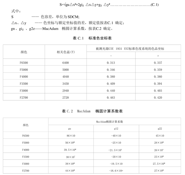 在 CIE1931XYZ標(biāo)準(zhǔn)色度系統(tǒng)中的色容差應(yīng)按公式(C.1)計(jì)算。