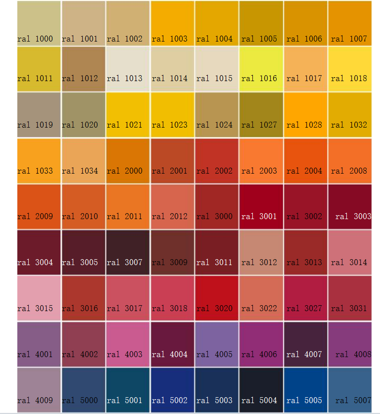 RAL系列提供了多種顏色的命名和對(duì)應(yīng)的RAL編號(hào),如RAL 1000米綠色(RAL 1000),RAL 1004金黃色(RAL 1004)等。