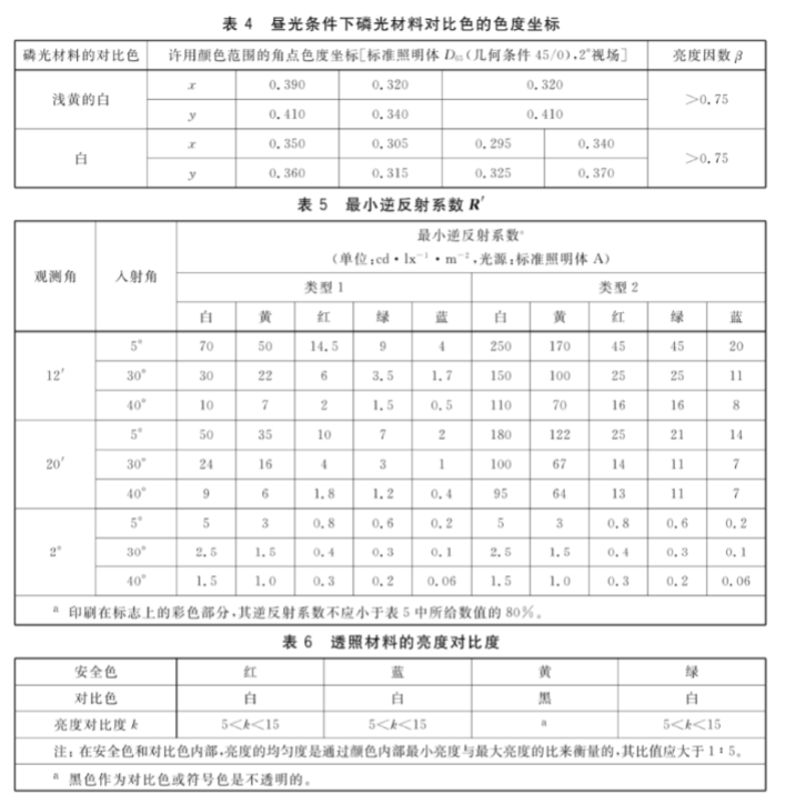 對于透照材料。和y坐標應在表2所給出的顏色范圍內,亮度對比度應在表6所給出范圍內。滿足以下條件,則認為安全色不符合要求: