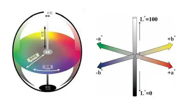 所有顏色都可以通過Lab色空間感知并測量,這些數(shù)據(jù)也可以用來表示標(biāo)樣同測試樣的色差,并通常以△Eab(總色差)△L、△a、△b表示。其計算式如下: