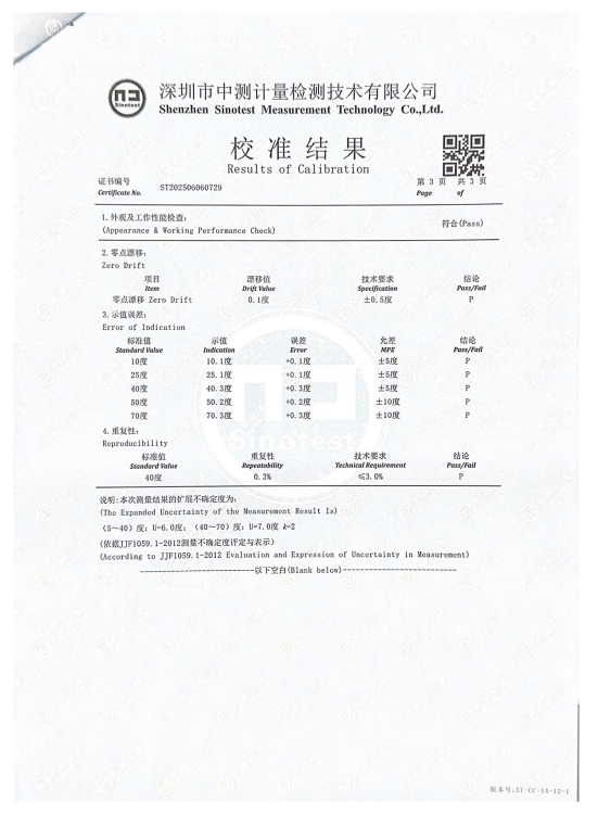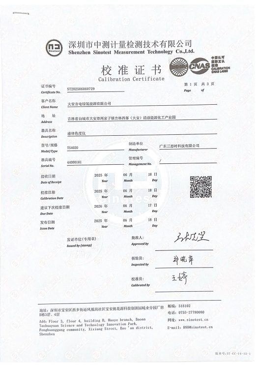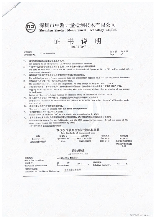 深圳市中測計量檢測技術有限公司(CNAS認可編號:L16333)于2025年6月18日出具校準證書(ST202506060729),確認送檢設備TS4020液體色度儀(序列號44000181)性能指標符合JJF1689-2018《水質色度儀校準規范》要求。