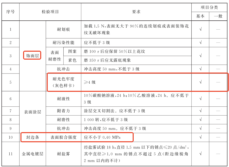 該規(guī)范對封邊條顏色并無明顯要求,我們可以參照其對飾面板的規(guī)定,即:耐光色牢度≥4級,同樣,對照GB 250-1995,也就是ΔE*ab控制在2以內(nèi)。
