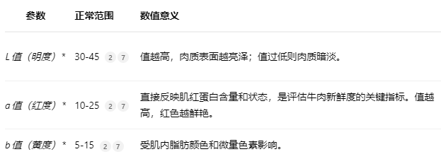 根據(jù)國家相關(guān)標(biāo)準(zhǔn)與多項研究,正常牛肉的顏色參數(shù)在Lab色彩空間中具有相對穩(wěn)定的范圍。Lab顏色空間由三個維度組成:L值代表明度(從0黑色到100白色),a值代表紅綠度(正值偏紅,負(fù)值偏綠),b值代表黃藍(lán)度*(正值偏黃,負(fù)值偏藍(lán))。正常牛肉的具體Lab值范圍如下表所示: