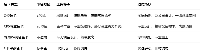 240色卡作為最普及的版本,采用扇形設計,包含從中性基礎色到流行色的全面選擇,足以滿足大多數家庭裝修需求。
