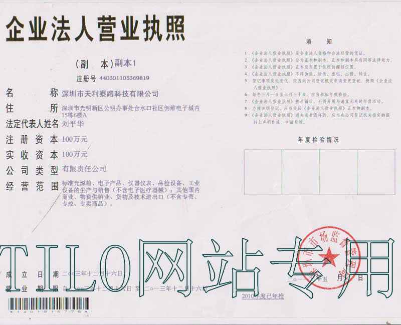 深圳市天友利標準光源有限公司、深圳市天利泰路科技有限公司(生產(chǎn)廠家)成立于1998年12月30日,先后注冊了商標:TILO、TAYOLE和天友利等,并在香港也成立了公司:卡羅卡超香港有限公司。