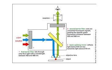 熒光鏡檢術是用短波長的光線照射用熒光素染色過的被檢物體,使之受激發后而產生長波長的熒光,然后觀察。