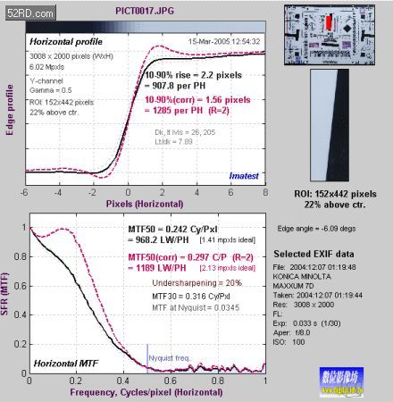 另一張圖則是顯示 MTF/SFR 主要數據,這部分與 Edge profile 相同,黑色實線為原始數據;紅色虛線則代表移除(或加上)數字相機內建銳利化效果的表現。 Imatest 會將原始 MTF 影像降低 50%的明亮度,來計算SFR,這樣的做法可以繼保留影像細節又不會被測試圖上的雜點所干擾,標示為 MTF50 以玆區別 。Imatest 會將計算出來的SFR值轉換成 LW/PH ( line widths per picture height ) 1個 LW/PH = 2 *line pairs per millimeter (lp/mm),供使用者判斷影像品質。