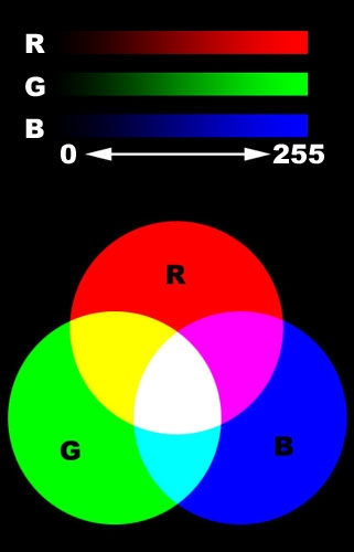 每一種色光的光線從0到255被分成256階,0表示這種光線沒有,255表示這種光線飽和的狀態,由此就形成了RGB這種色光模式。當R=G=B =0,即三種色光都同時不發光時就成了黑色。三種光線兩兩相加,又形成了青、品、黃色。光線越強,顏色越亮,后,當R=G=B=255,即三種色光都同 時發光到亮就成了白色,所以RGB模式被稱為加色法。