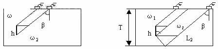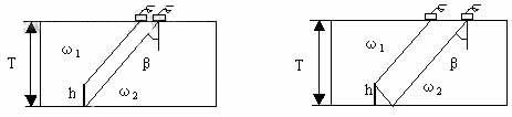 對于有傾角的裂紋,如下圖,若上端點和下端點由一次波探測到(左圖),一次波聲程分別為ω1和ω2,則其垂直高度h為