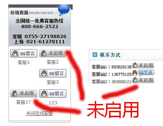 9月2日開始,123儀器商城右側的在線客服滑動條上兩個QQ:客服2和客服17,圖標突然顯示為未啟用。