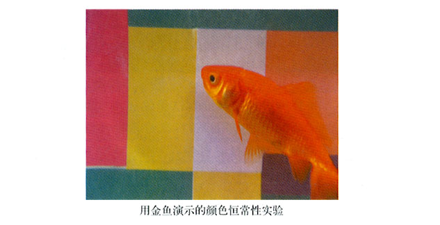 令人吃驚的是,顏以恒常性特性其實是神經(jīng)系統(tǒng)的一種非常基本的特征。它不包含記憶的作用,更沒有高級的思維因素,似乎是深植于我們視覺系統(tǒng)底層結(jié)構(gòu)中的某種東西。事實上,顏色恒常性已經(jīng)在像金魚這類具有簡單神經(jīng)系統(tǒng)的動物身上得到了證實(見圖1-25)。對于人類,顏色恒常性看來是視網(wǎng)膜中央-四周區(qū)域視場上發(fā)生的類似相反色作用的結(jié)果,然而這個相反色作用卻不是發(fā)生在視網(wǎng)膜的第二層,中央-四周區(qū)域視場對顏色恒常性的響應(yīng)似乎發(fā)生在大腦的視覺皮層,而且它們遠(yuǎn)比相反色的起因復(fù)雜。