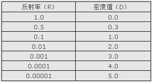 為了更好地理解密度的含義,我們設想有一個能夠100%反射入射光的表面,我們稱這樣的表面為完全漫反射體。這個表面的反射率R=1.0,因此密度值就是0。如果我們進一步考察其他的一些表面,它們分別可以反射入射光的50%,1%,0.1% …… 因此,我們就可以得到下面的一系列數值: