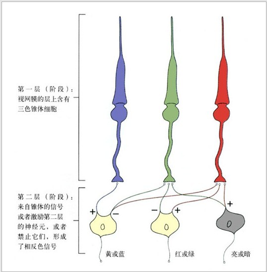 (圖1-14:神網(wǎng)膜中的三色學(xué)說(shuō)與相反色學(xué)說(shuō))