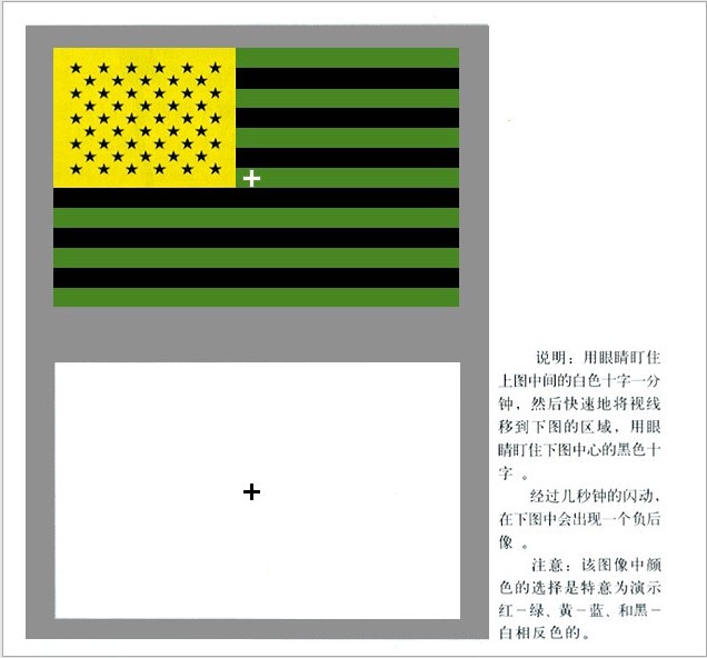 其他三色學(xué)說(shuō)無(wú)法解釋的顏色視覺(jué)現(xiàn)象。我們無(wú)法想像一種帶紅的綠或帶綠的紅。這一事實(shí)說(shuō)明有些現(xiàn)象已經(jīng)超出了三種獨(dú)立感受器(三色學(xué)說(shuō))所能解釋的范疇。對(duì)于藍(lán)和黃也同樣存在這種問(wèn)題,因?yàn)槲覀円矡o(wú)法想像帶有黃色的藍(lán)。圖1-12和圖1-13所示的的同時(shí)對(duì)比與負(fù)后像現(xiàn)象是另外兩個(gè)顏色視覺(jué)現(xiàn)象的例子,它們說(shuō)明,若缺少了某個(gè)顏色,則會(huì)產(chǎn)生出與該顏色互補(bǔ)的顏色感覺(jué)。后,顏色視覺(jué)異常的人(色盲)缺失的顏色感覺(jué)通常是成對(duì)的:一個(gè)人的紅色響應(yīng)異常,則通常他也缺少綠色辨別能力;一個(gè)人若沒(méi)有藍(lán)色響應(yīng),則也一定沒(méi)有黃色響應(yīng)。