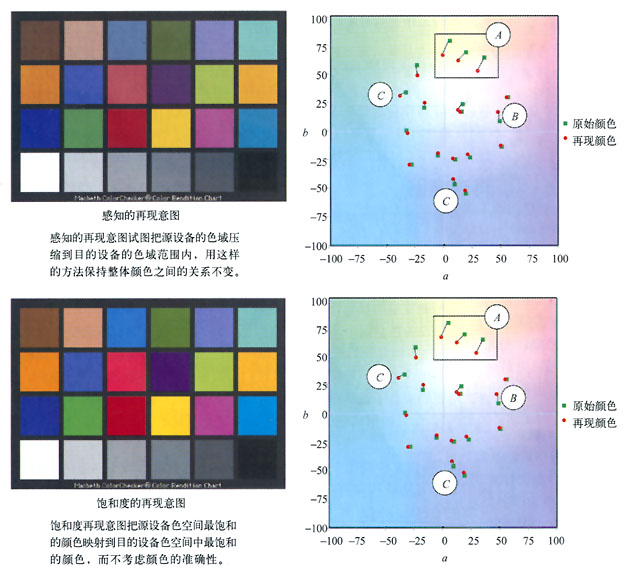 我們使用四種再現意圖的每一種將如圖所示的MacBeth Color Checker色標再現為CMYK數值。每個再現意圖的結果都表示在LAB色空間的a,b平面上。用綠色點表示原始的顏色,而用紅色點表示相應的再現顏色。