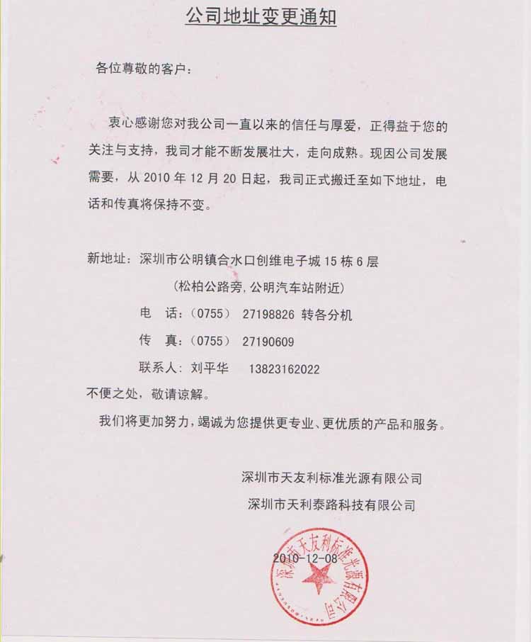 深圳市天友利標準光源有限公司地址變更通知