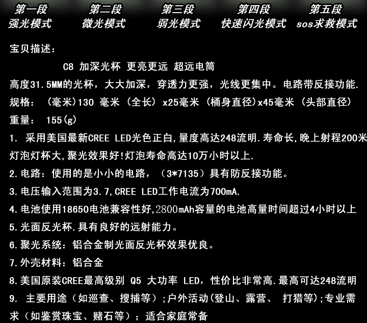 套裝包括:正品Q5燈炮,C8五檔手電筒1只,充電器一個,明珠品牌18650充電鋰電池2800豪安+備用18650鋰電池<共兩個電池>,手繩一條。