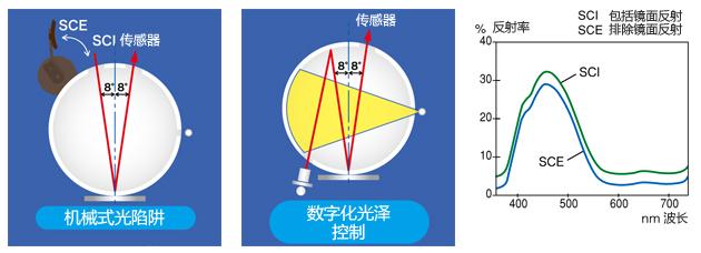 通過(guò)特殊的數(shù)字化光澤控制方式同時(shí)測(cè)量SCI和SCE,僅需4秒即可連續(xù)測(cè)量。與傳統(tǒng)機(jī)型不同的是,無(wú)需在SCI和SCE模式之間進(jìn)行頻繁的機(jī)械切換,這樣就提高了工作效率。由于在切換模式時(shí)測(cè)量區(qū)域不會(huì)變化,因此可提供穩(wěn)定的測(cè)量數(shù)據(jù)。