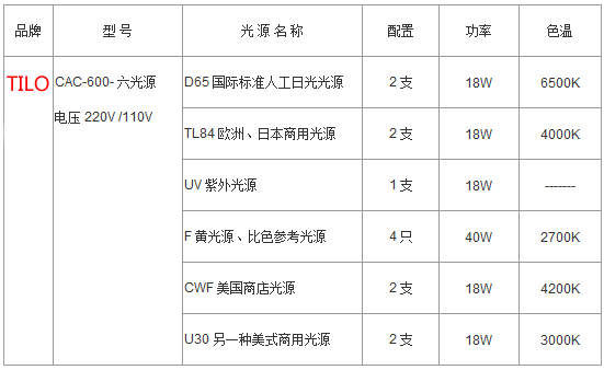 標準光源對色燈箱參數: