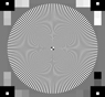 Modulated Sinusoidal Siemens Star The TE253 is designed for checking resolution. The chart contains a radially sine modulated Siemens star in the center of the image, gray patches and black squares with a small white square in it. |