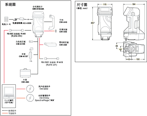 | 標準配件 | 白色校正板CM-A138 外箱CM-A64 手帶CM-A137 手柄CM-A43 RS-232C連接線IF-A12 電源適配器AC-A308 5號電池×4 用戶校準軟件CM-S20w |